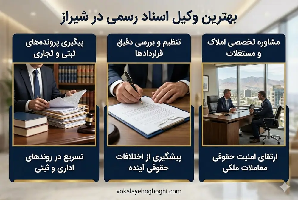 موثرترین راه برای اسناد رسمی و بر طرف کردن مشکلات آن، مراجعه به بهترین وکیل اسناد رسمی در شیراز است. وکیل با داشتن دانش و تجربه لازم، می‌تواند به شما در فهم بهتر مسائل حقوقی کمک کند و به شما راه‌حل‌های موثری ارائه دهد. وکیل با بررسی دقیق اسناد و مشکلات آنها، می‌تواند به شما در انتخاب بهترین راه‌حل و حل مشکلات کمک کند. از طریق مشاوره با وکیل ماهر، می‌توانید اطمینان حاصل کنید که مسائل حقوقی شما به بهترین شکل ممکن مدیریت شده و راهکارهای مناسبی ارائه خواهد شد.